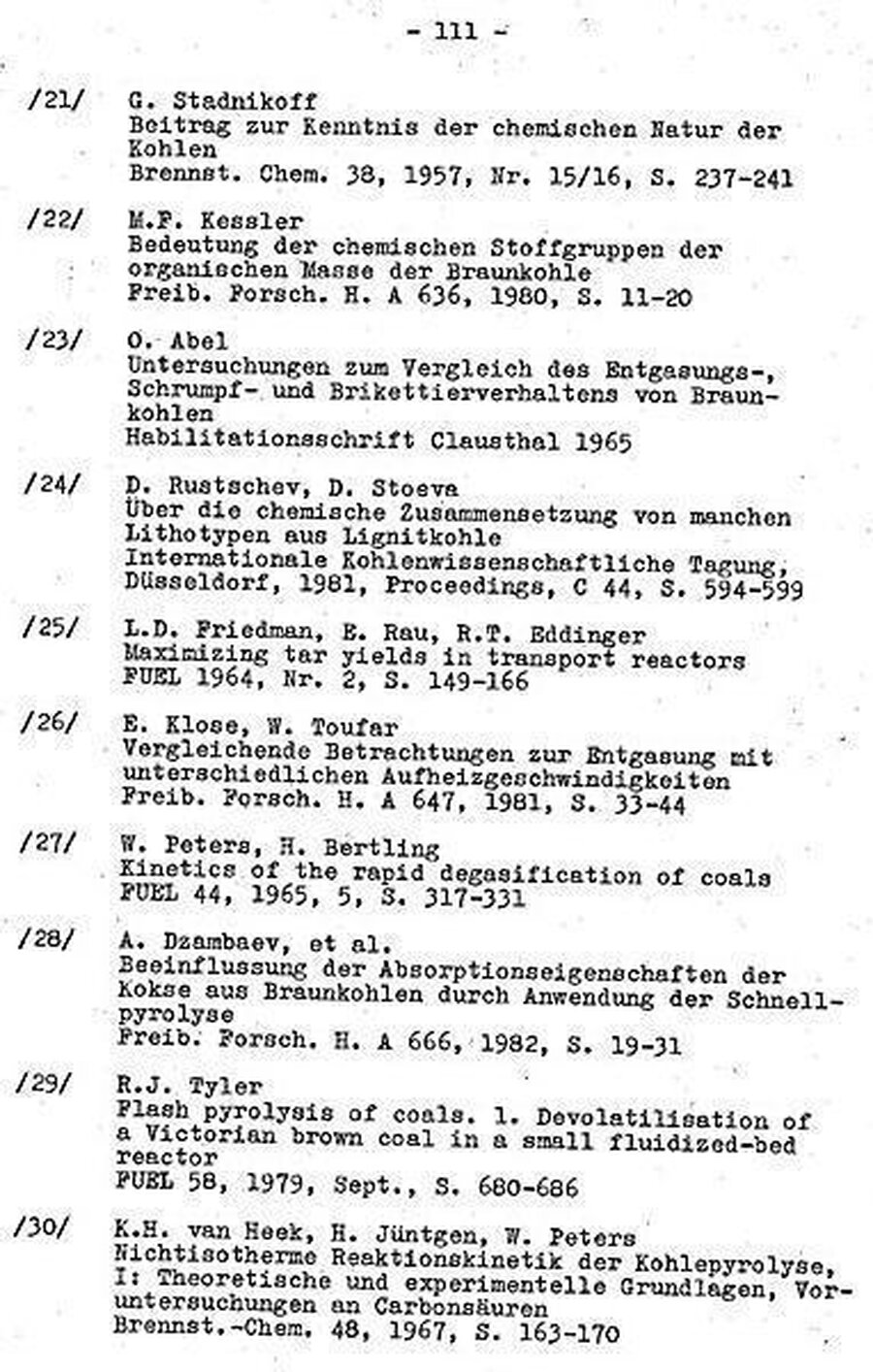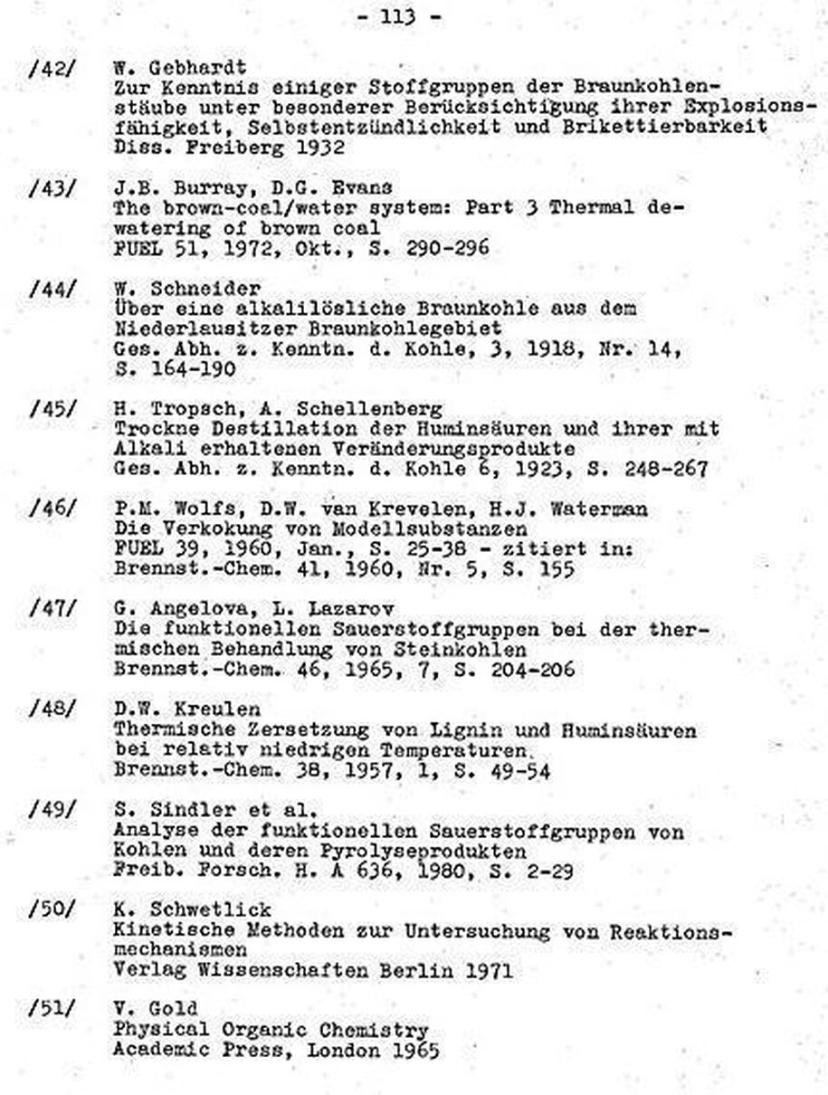 Da die Vorbehandlungstemperatur aber unter der Teerentbindungstemperatur (290oC) bleiben muß, kann diese Pyrolysestufe nur die Umwandlungs- und Abspaltreaktionen erfassen, die unterhalb dieser Temperatur ablaufen können. Weil aber Carboxylgruppen existieren, die bei dieser Temperatur noch thermostabil sind /75/, kann die erzielbare Sauerstoffabreicherung nur einen Teil des als CO2 abspaltbaren Sauerstoffs der Kohle erfassen. Auch die Umwandlungsvorgänge, die von Angelova/Lazarov /47/ zwischen 250 und 500°C an Steinkohlen beobachtet wurden, haben sicher auch für Braunkohlen Bedeutung und beeinträchtigen die Qualität der Teere, wenn sie durch kurze Verweilzeiten bei der Pyrolyse unterdrückt werden.