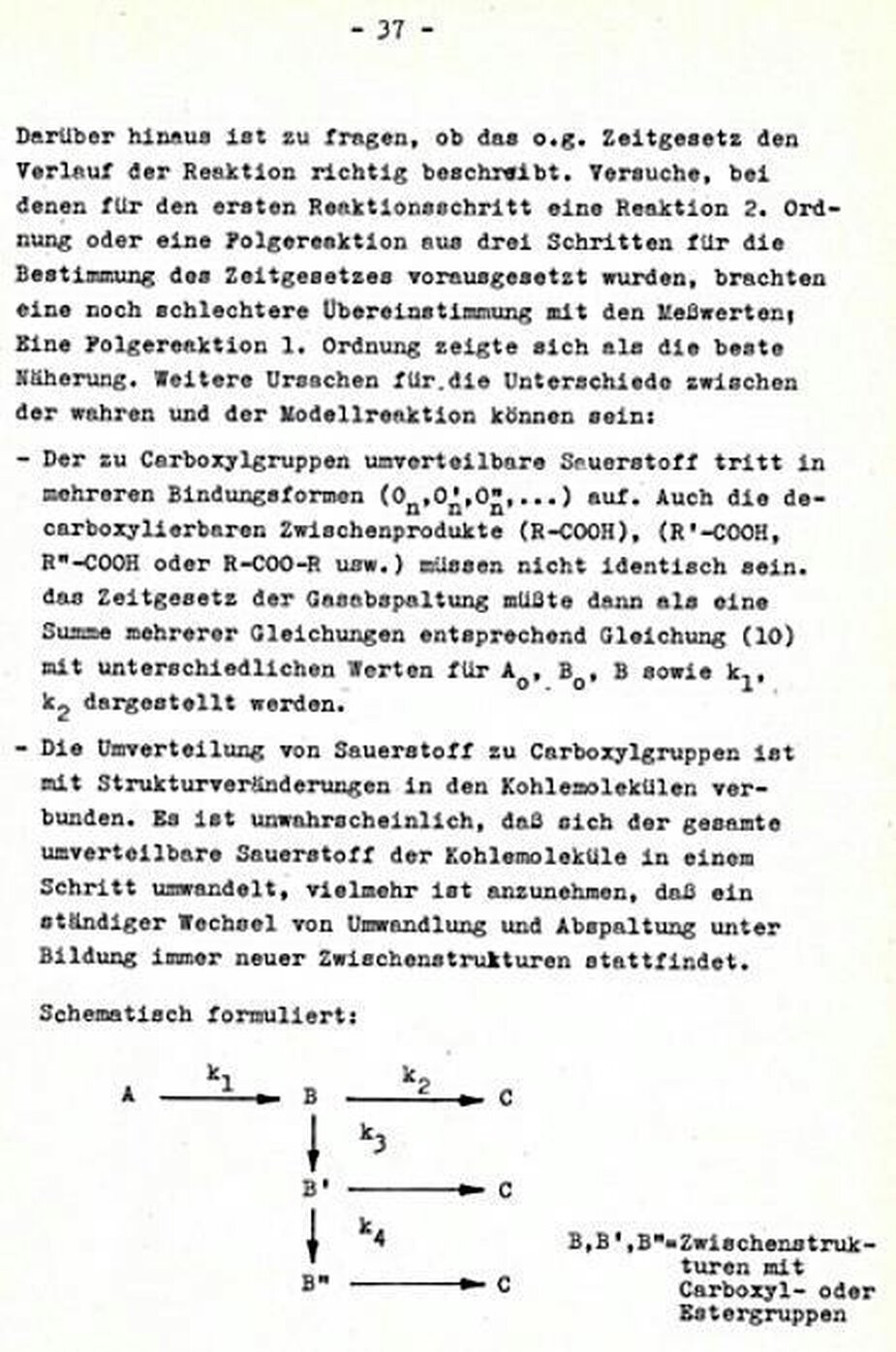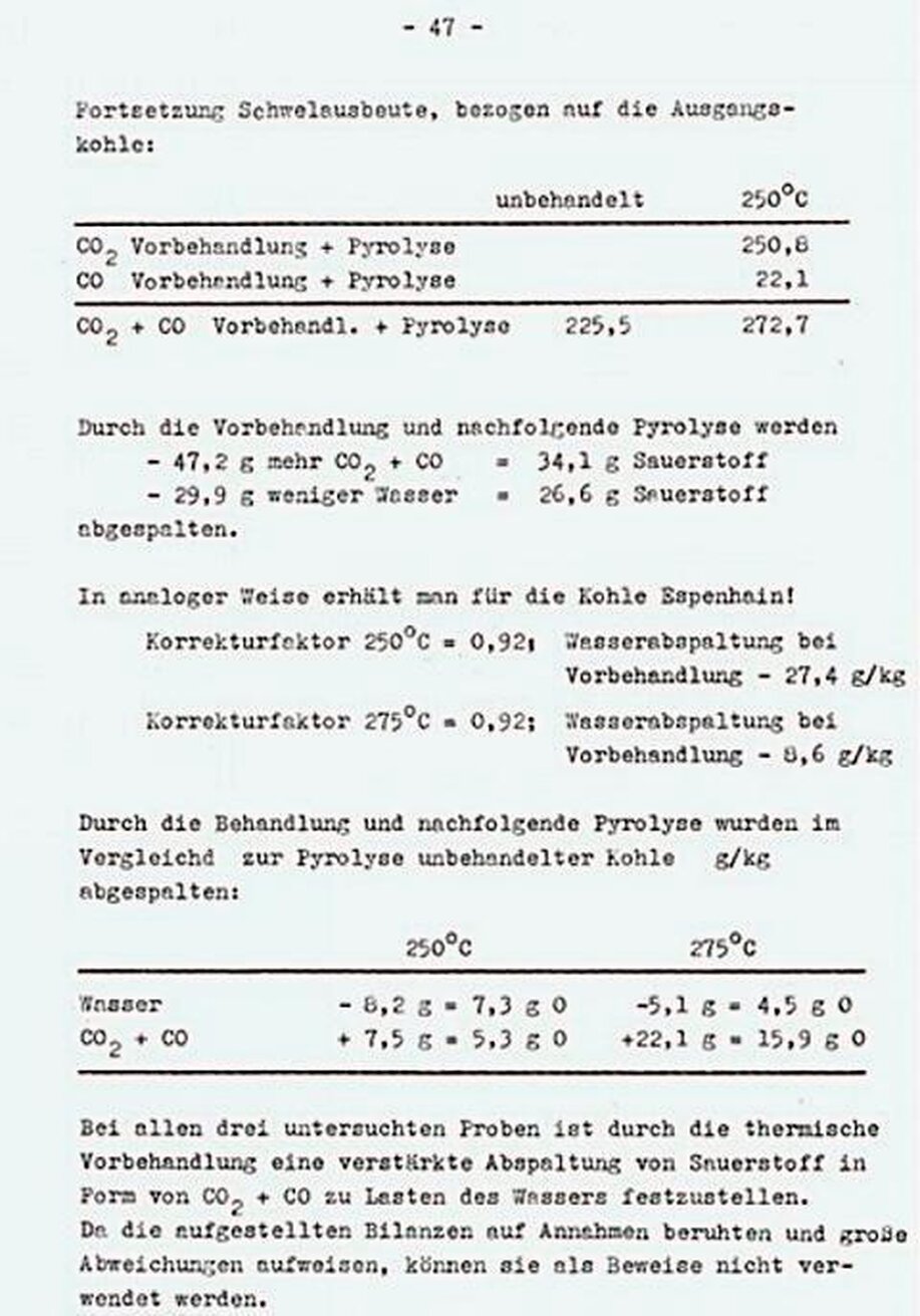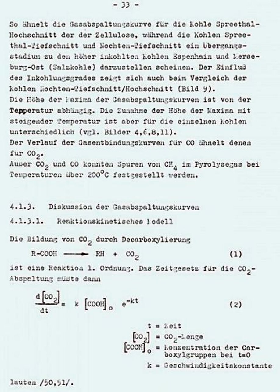 "Die Bildung von CH4 und CO nach ähnlichen Zeitgesetzen wie für die CO2-Bildung legt nahe, dass die Sauerstoffumverteilung und die CO2-Abspaltung nur Teil eines "größeren Komplexes von Reaktionen sind, in deren Verlauf die Struktur der Moleküle geändert wird und Carboxyl-, Carbonyl-, Hydroxyl- und Methylgruppen gebildet und abgespalten werden.