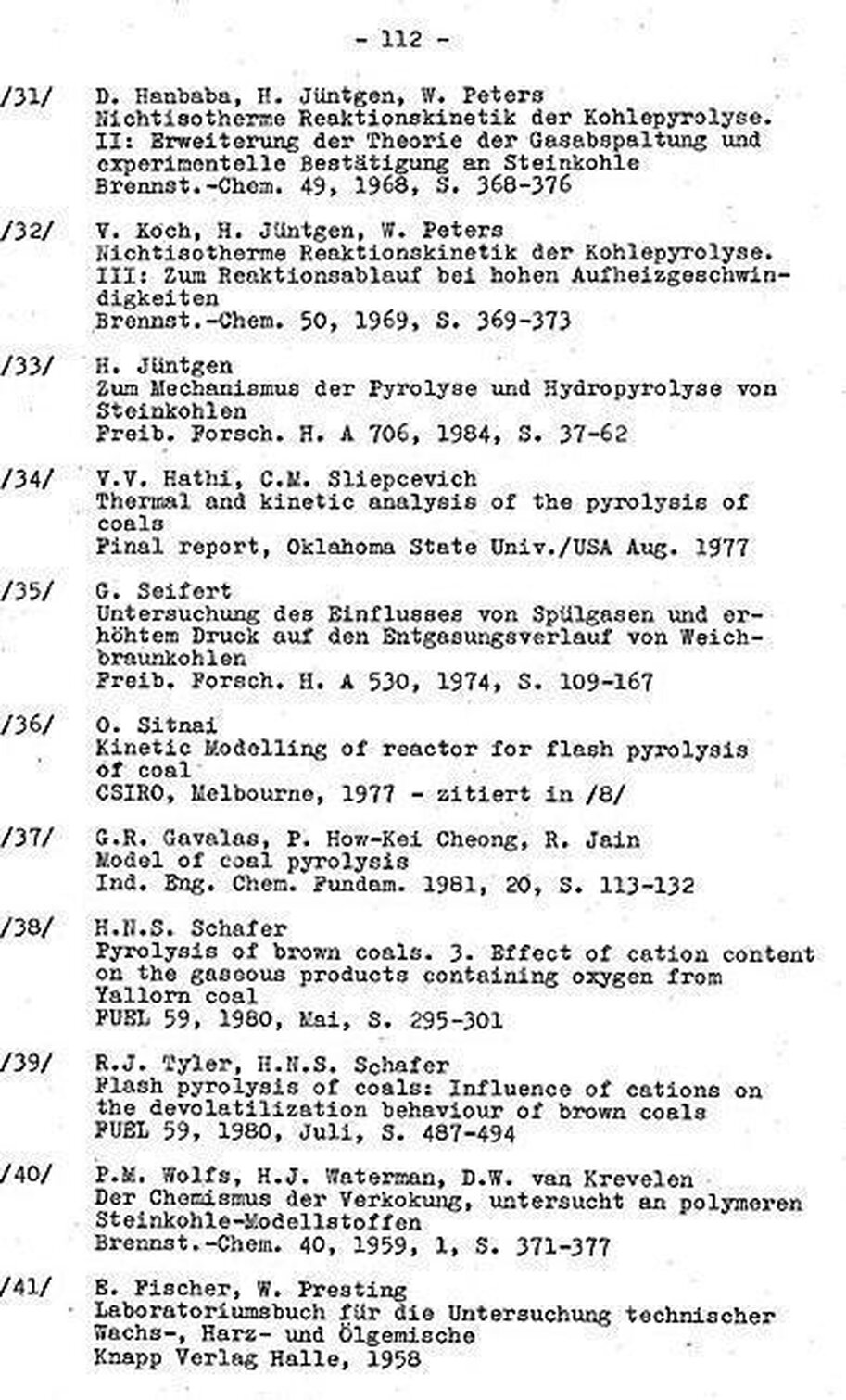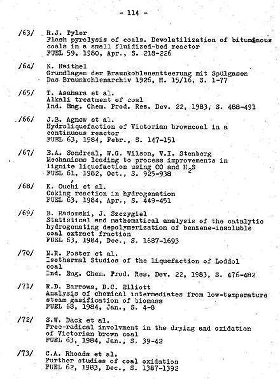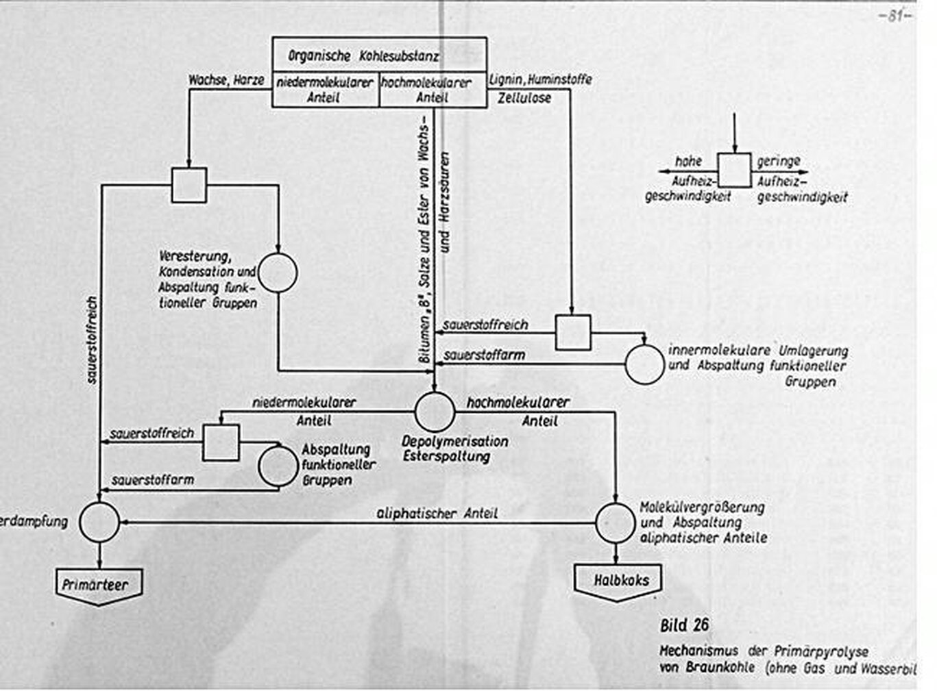 "Die Bildung von CH4 und CO nach ähnlichen Zeitgesetzen wie für die CO2-Bildung legt nahe, dass die Sauerstoffumverteilung und die CO2-Abspaltung nur Teil eines "größeren Komplexes von Reaktionen sind, in deren Verlauf die Struktur der Moleküle geändert wird und Carboxyl-, Carbonyl-, Hydroxyl- und Methylgruppen gebildet und abgespalten werden.