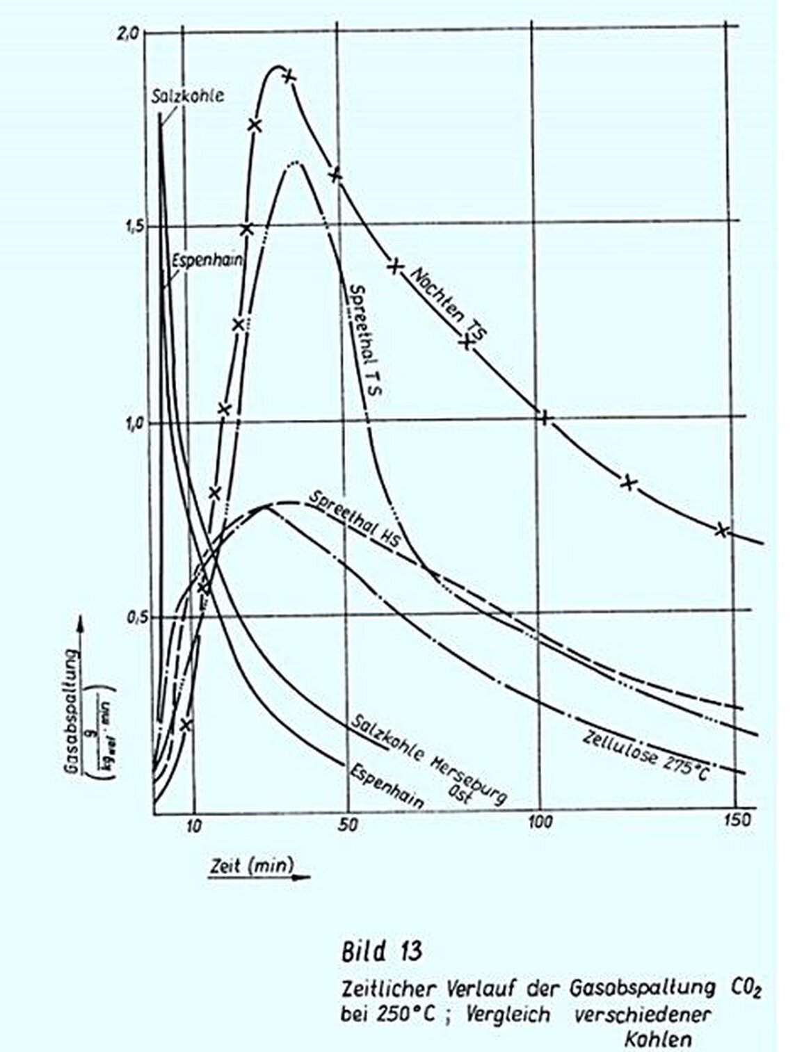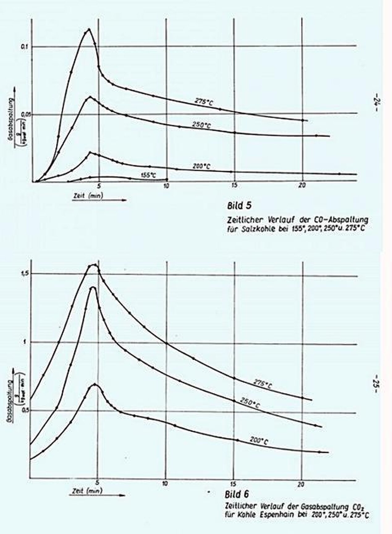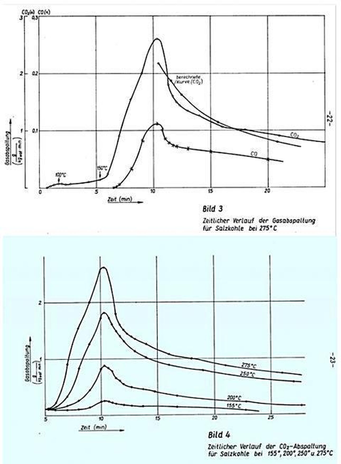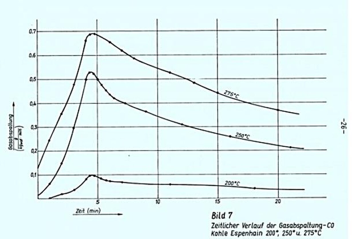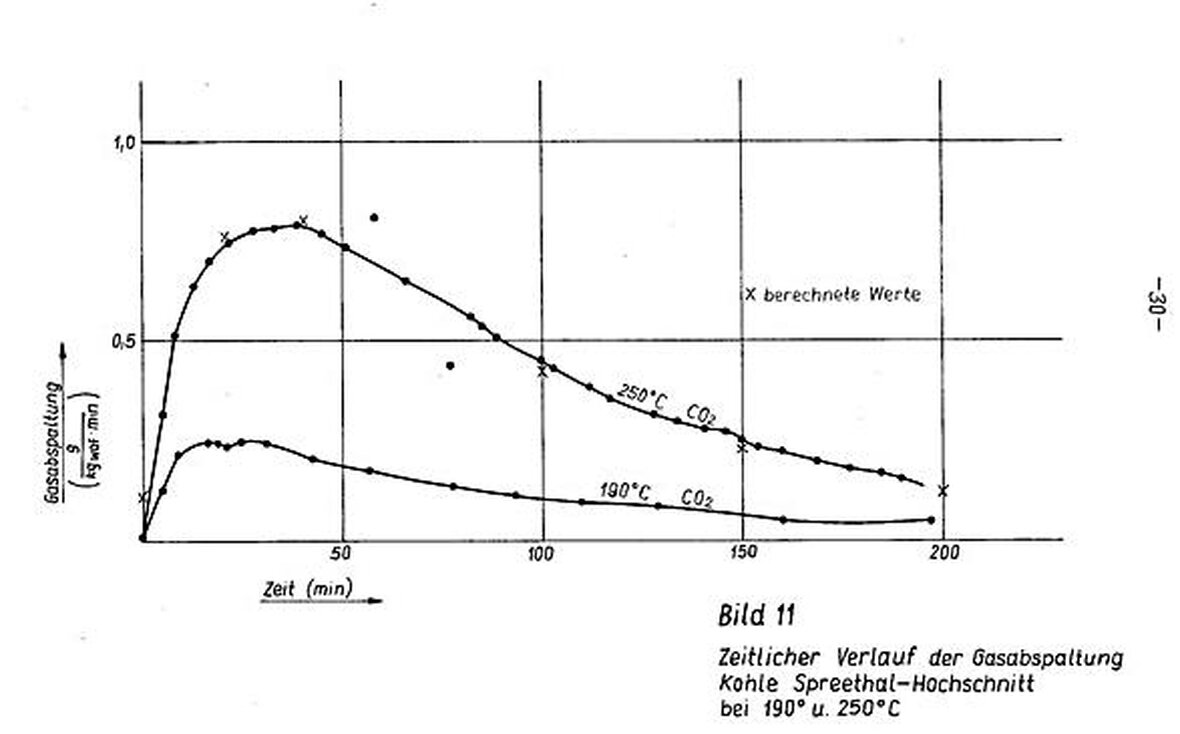 Um seine Allgemeingültigkeit für die Kohlepyrolyse zu belegen, müssen die Abspaltungskurven aller Pyrolyseprodukte mit denen von CO2 qualitativ übereinstimmen. Für CO (Bilder 3,4 u, 5, 6 u, 7) ist die Ubereinstimmung vorhanden. Sie ist für andere Pyrolyseprodukte noch nachzuweisen.