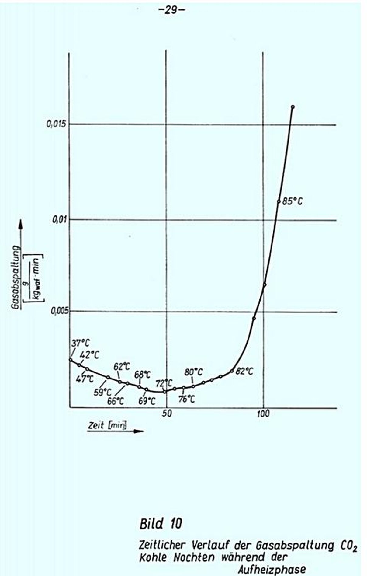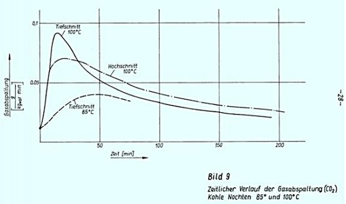 Die Gasabspaltung erreicht zwischen 35 und 37°C ein flaches Maximum (Bild 10). Eine spürbare Zunahme der CO2-Abspaltung tritt bei weiterer Erwärmung erst ein, wenn die Kohletemperatur 80°C überschreitet. Ein zweites Maximum der Gasabspaltung wird zwischen 82 und 85°C erreicht (s.a. Bild 9), wenn die Temperatur nicht weiter erhöht wird. Bei weiterer Temperatursteigerung bis 100°C steigt auch die CO2-Bildung, die im Verlauf der Kohletrocknung etwas zurückgeht. Die Trocknung der Kohle dauert beim beschriebenen Versuchsaufbau 4 - 8 Minuten. Sie ist in den meisten Bildern nicht dargestellt. Erst mit Ende der Trocknung', das bei einer