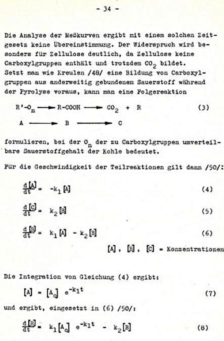 Vielzahl parallel verlaufender Folgereaktionen besteht, deren Ausgangsprodukte sich ständig ändern. Dieser Modellansatz erweitert die aus nichtisothermen reaktionskinetischen Messungen abgeleiteten Vorstellungen über die Kohlepyrolyse (s , Pkt. 3.2.). Die Ableitung des odellansatzes erfolgte aus den Gasabspaltungskurven von CO2.