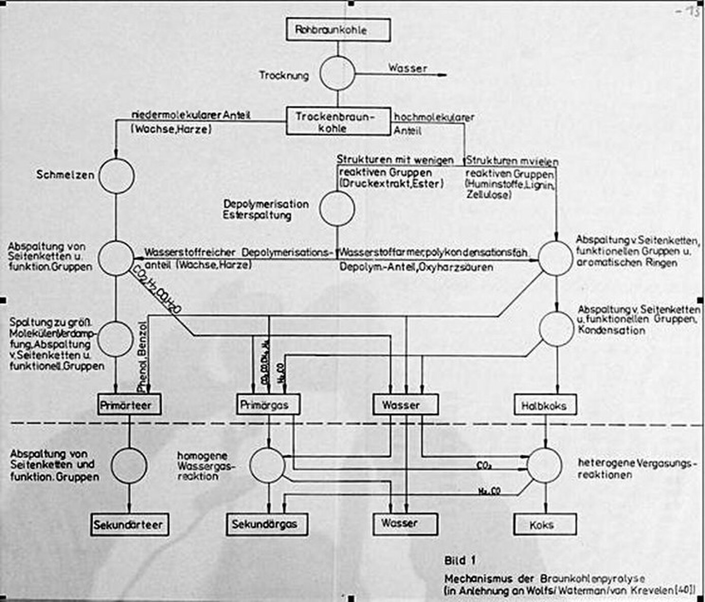 Trotz dieser Schwierigkeiten sollte es möglich sein, die wichtigsten Reaktionen der Hauptstoffgruppen zu erfassen und schematisch so zu ordnen, dass der Ablauf der Pyrolyse in seinen Grundzügen richtig wiedergegeben wird. In diesem Sinne wurde von Wolfs, Watermann und v. Krevelen /40/ auf der Grundlage von Versuchen mit Modellsubstanzen ein Mechanismus der Verkokung von Steinkohle vorgeschlagen. Das von diesen Autoren aufgestellte Schema lässt sich bei Beachtung der stofflichen Zusammensetzung der Braunkohle auch auf diese anwenden