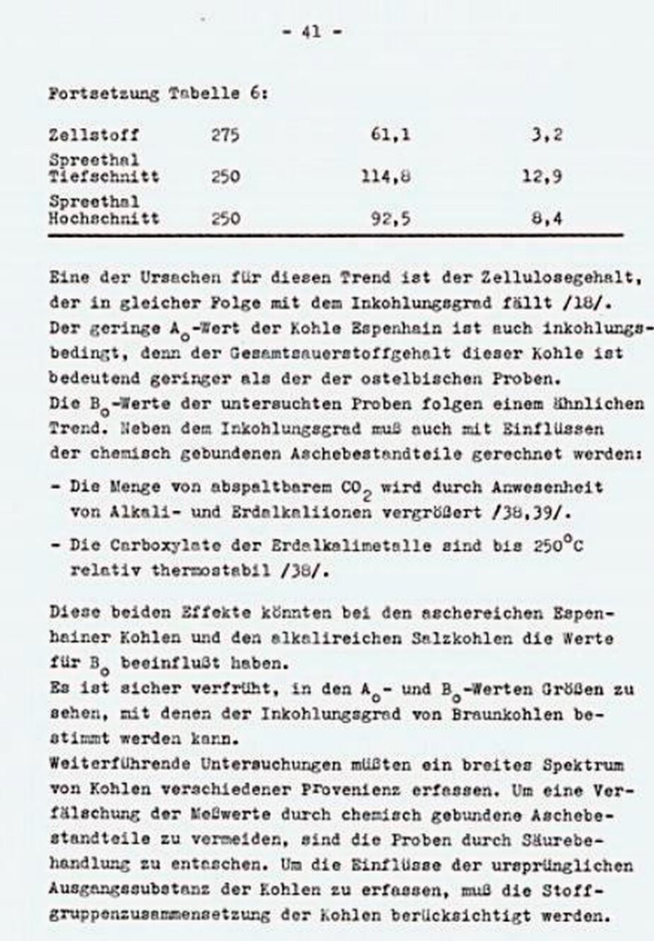 Die Temperaturabhängigkeit für die Bildung von Carboxylgruppen (kl) zeigt keinen klaren Trend. Die Zahlemwerte für kl sind bei älteren Braunkohlen (Salzkohle, Espenhain um mehr als zwei Größenordnungen größer als bei jüngeren Kohlen (Nochten, Spreethal) und Zellstoff. Hier scheinen