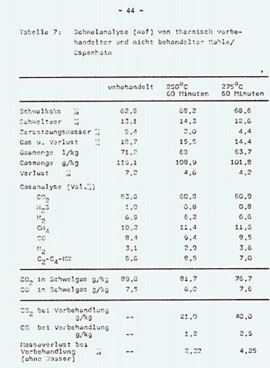 Die thermische Vorbehandlung ist eine Veredelungsstufe, mit der Kohlen unterschiedlichen Inkohlungsgrades in ihren Eigenschaften teilweise einander angeglichen werden können. Bei den im Punkt 4.2. eingesetzten Kohlen wurde durch die CO2/CO-Abspaltung eine Angleichung der Sauerstoffgehalte erzielt: