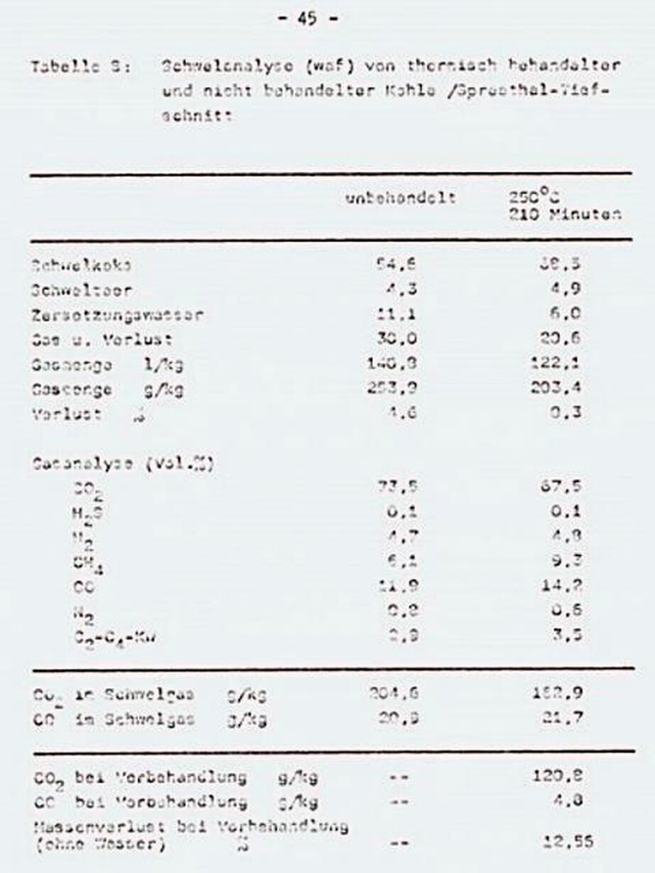 Auf diese Weise müsste die Teerausbeute durch thermische Behandlung zurückgehen. Demgegenüber fand Kohl /81/, dass mit steigendem Inkohlungsgrad sich die Teerausbeute bei der Schnellpyrolyse erhöht. Da die thermische Behandlung den Inkohlungsgrad der Kohle erhöht, könnte also zumindest bei der Schnellpyrolyse ein positiver Effekt auf die Teerausbeute auftreten.
