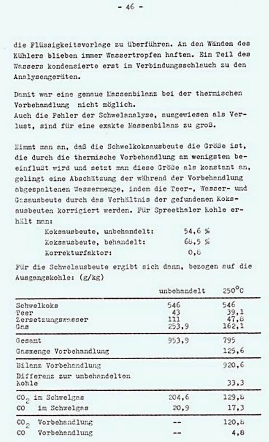 Wenn diese Reaktion durch kurze Verweilzeiten unterdrückt wird, gelangen polykondensationsfähige Harze in den Teer, dessen Ausbeute dabei zwar steigt, aber dessen Qualität sich verschlechtert. Da ostelbische Kohlen harzreich sind, ist für diese Kohlen eine Erhöhung des Harzanteils im Schwelteer mit Verminderung der Verweilzeit zu erwarten. Durch thermische Behandlung der Kohle vor der Pyrolyse ist es möglich, die Differenzen in den Rohstoffeigenschaften, nie durch Unterschiede im Inkohlungsgrad bedingt sind, anzugleichen. Ob Rohstoffeigenschaften, die auf die pflanzliche Ausgangssubstanz zurückgeführt werden können, beeinflussbar sind, ist wenig wahrscheinlich. Durch thermische Behandlung der Kohle ist es lediglich möglich, polykondensationsfähige Harze in nicht flüchtige Verbindungen umzuwandeln und so aus dem Teer fernzuhalten.