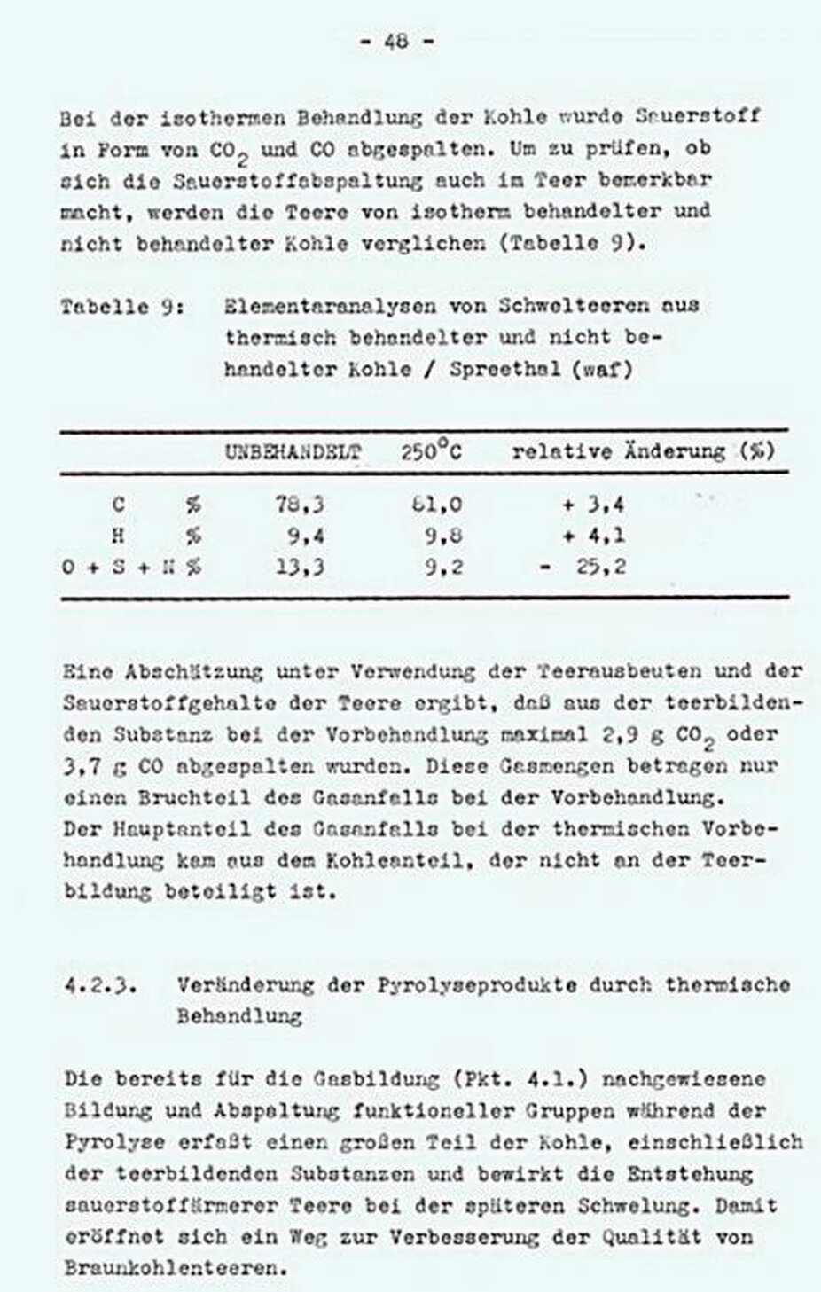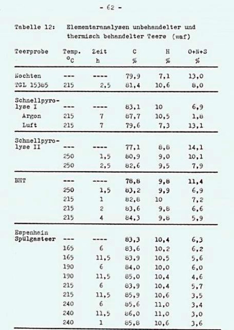 Der Teer aus thermisch behandelter Kohle (Spreethal) - Tabelle 9 - enthält dagegen nur 25% weniger Sauerstoff als der Teer aus unbehandelter Kohle.