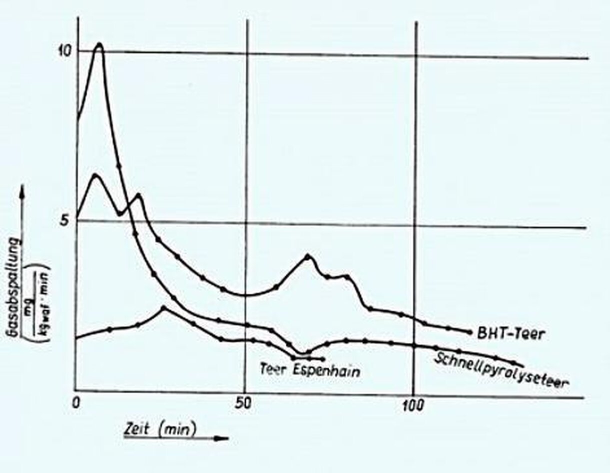 Einen wesentlichen Unterschied zu den Braunkohlen zeigt der BHT-Teer. Seine Gasabspaltungskurve fällt nicht monoton nach Durchlaufen des Maximums, sondern zeigt noch mehrere Maxima, die nicht auf Temperaturschwankungen zurückgeführt werden können. Ähnliche, aber weniger deutlich ausgeprägte Maxima nach dem Hauptmaximum sind auch beim Schnellpyrolyseteer erkennbar.