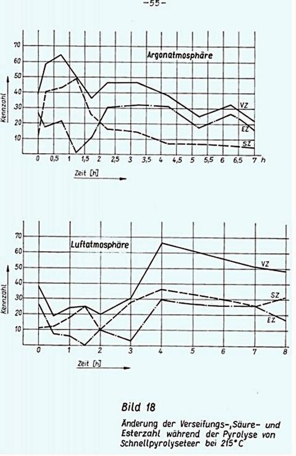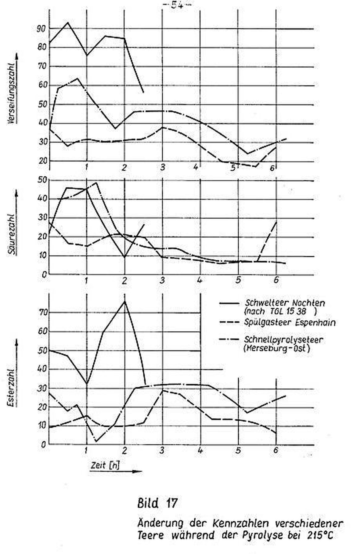 - Bestimmung der Änderung der Verseifungs- und Säurezahl bei verschiedenen Pyrolysetemperaturen, Versuchsdauer 8 - 11 Stunden; Abstand zwischen zwei Proben O,5 bis 1 Stunde; Versuchsmaterial: Spülgasteer Espenhain, Schnellpyrolyseteer Merseburg-Ost, Schwelteer Nochten (nach TGL 15385)