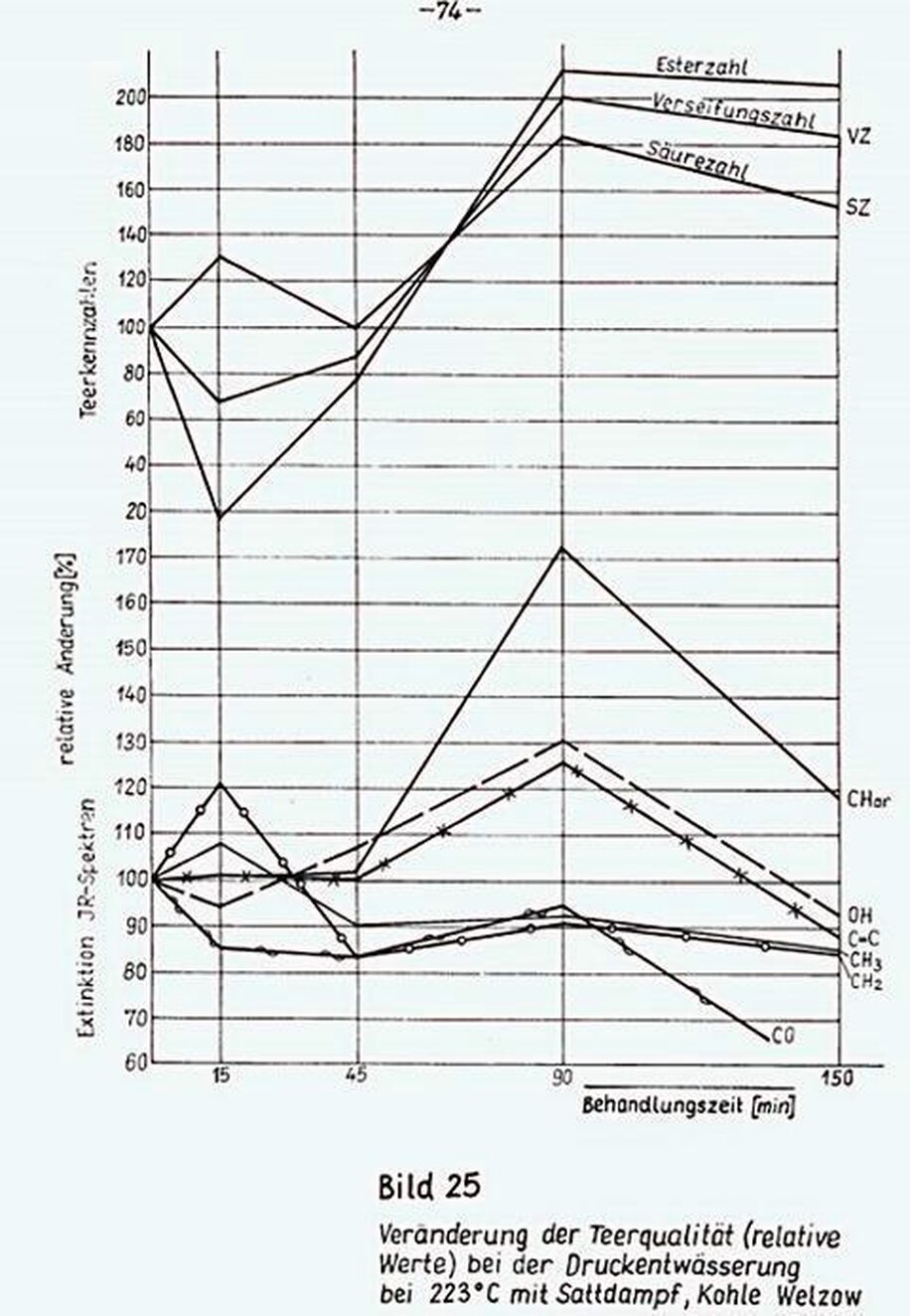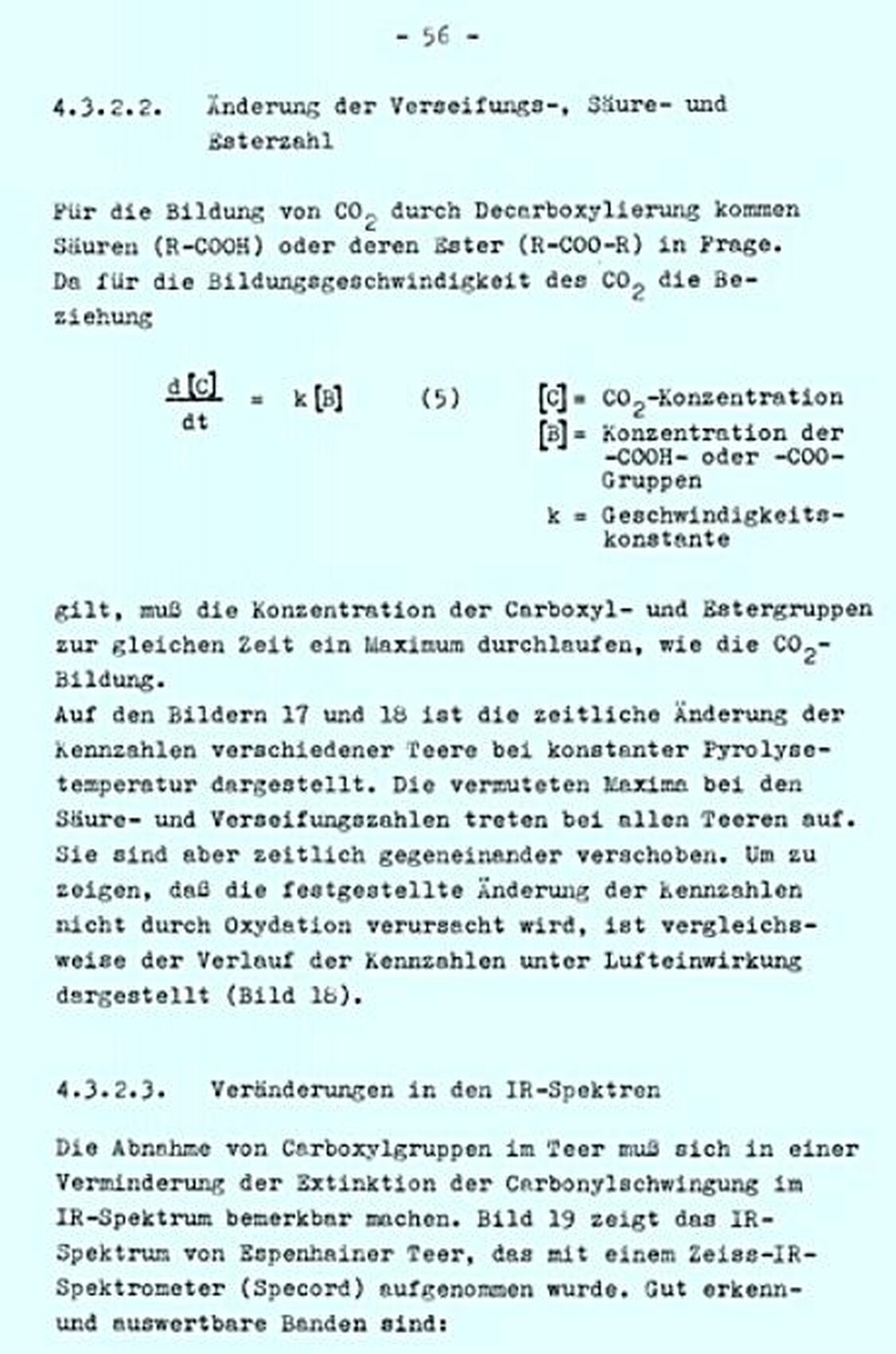 Der zeitliche Verlauf der Säure-und Esterzahlen beweist, dass diese Gruppen als Zwischenprodukte tatsächlich auftreten. Der unterschiedliche Verlauf beider Kennzahlen zeigt aber, dass die Bildung von Carboxyl-und Estergruppen nach unterschiedlichen Mechanismen erfolgt. Obwohl eine Kopplung beider Reaktionen über das Estergleichgewicht möglich ist, ist eine Abhängigkeit beider Reaktionen voneinander nicht sichtbar. Mit dem Auftreten mehrerer Maxima in den Ester-und Verseifungszahlen wird das Auftreten mehrerer Maxima in der CO2-Abspaltung verständlich. Bei der Braunkohle trat in der Regel nur ein Maximum auf. Hier zeigen sich Unterschiede im Reaktionsablauf zwischen Braunkohlen und ihren Teeren.