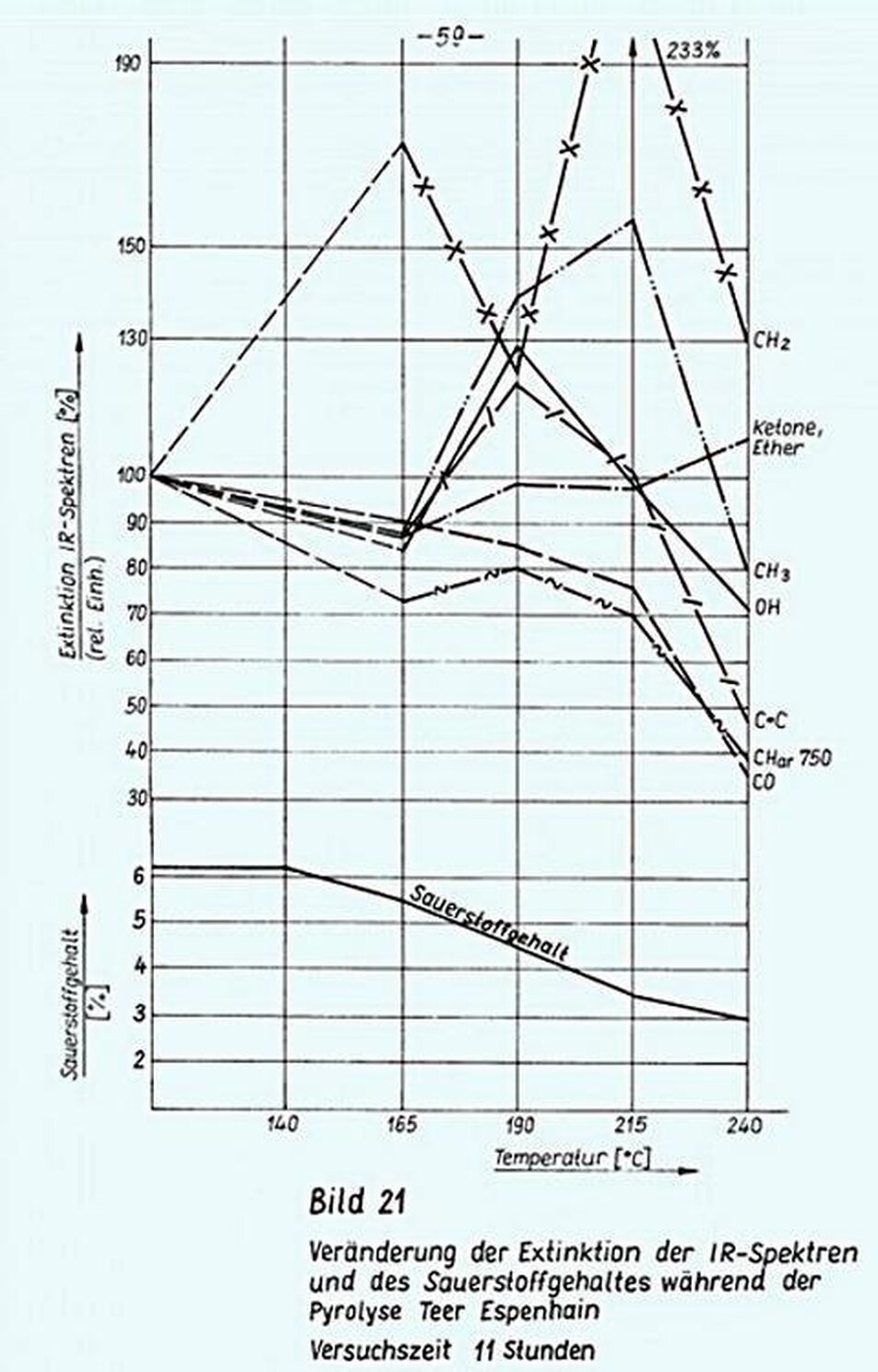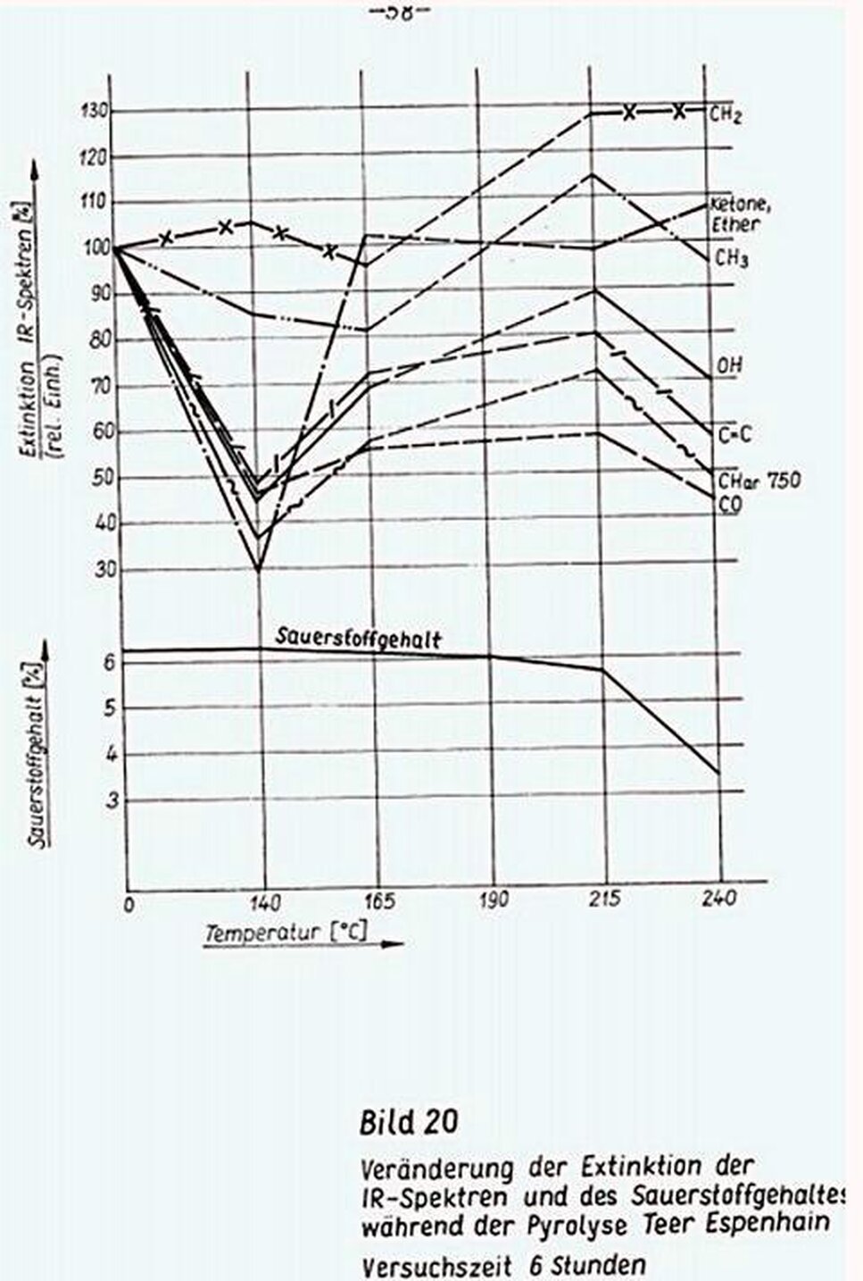 Überraschenderweise sind nicht nur die sauerstoffhaItigen Molekülfragmente in ihrer Extintkion beeinflusst, sondern auch solche, die als thermostabil gelten, wie die C==C- Bindung und der aromatisch gebundene Wasserstoff. Das weist auf eine tiefgreifende Strukturveränderung in den Molekülen hin, deren Teil die gesuchte Umverteilung des Sauerstoffs zu funktionellen Gruppen ist.