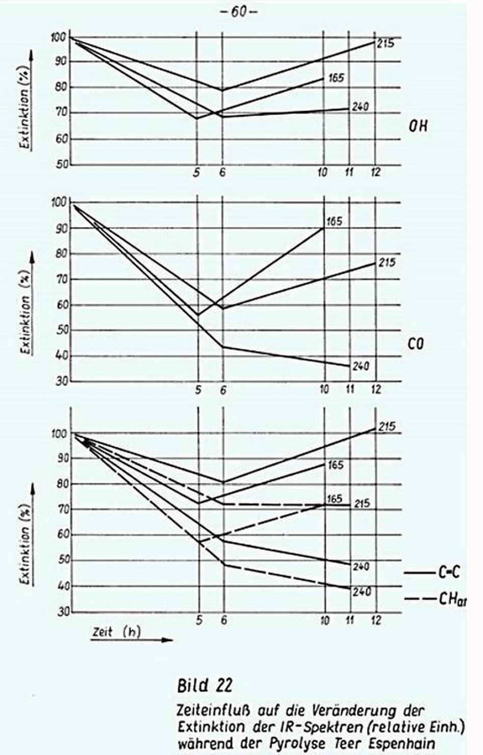 Die Extinktion einer Bande ist keine Größe, aus der auf die Konzentration der betreffenden Molekülfragmente direkt geschlossen werden kann. Die Veränderung der Extinktion zeigt nur eine qualitative Zu-oder-Abnahme der Konzentration der Molekülfragmente. Die Bilder 21 und 22 zeigen die Veränderung der ausgewerteten Banden, sowie der Elementaranalysen von Espenhainer Teer in Abhängigkeit von der Pyrolysetemperatur nach 5 - 6 bzw. 10 - 12 Stunden Reaktionszeit. Auf Bild 22 ist der Einfluss der Reaktionszeit herausgestellt. Der erwartete Einfluss der Pyrolysetemperatur und -zeit auf die Extinktion ist sichtbar.