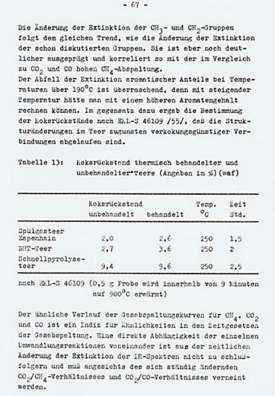 Im Unterschied zur Kohle werden aus dem Teer bedeutende Mengen CH4 abgespalten. Das Verhältnis beider Gasmengen bleibt im Versuchsverlauf nicht konstant.