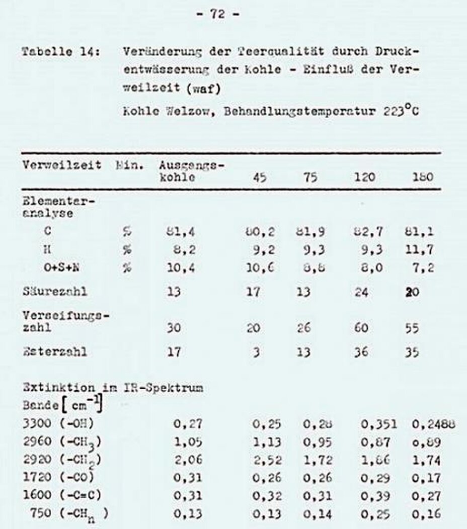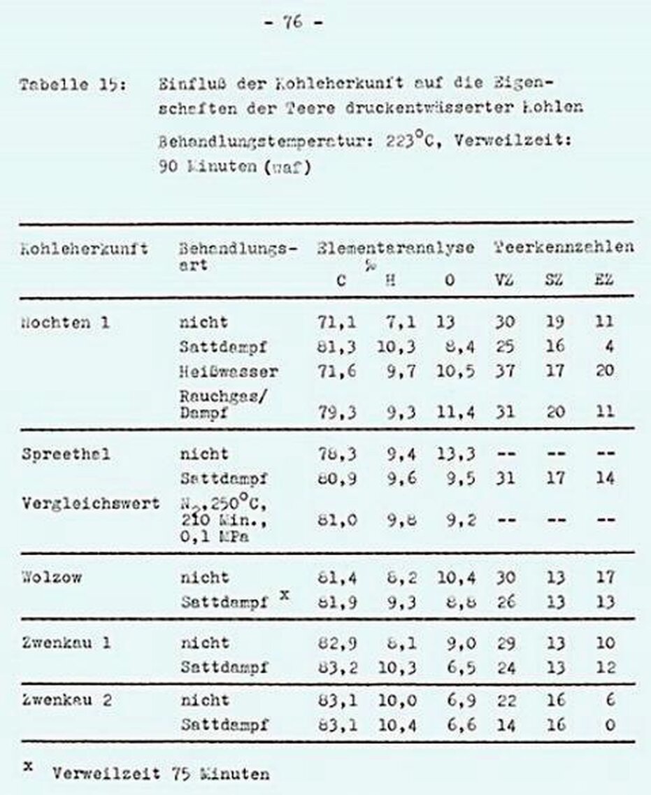 Hinsichtlich der Teerqualität ist für Braunkohlen zu erwarten, dass ihr im Vergleich zu Steinkohlen hoher Anteil an abspaltbarem, umverteilbarem Sauerstoff sich bei der Schnellpyrolyse besonders nachteilig bemerkbar macht.