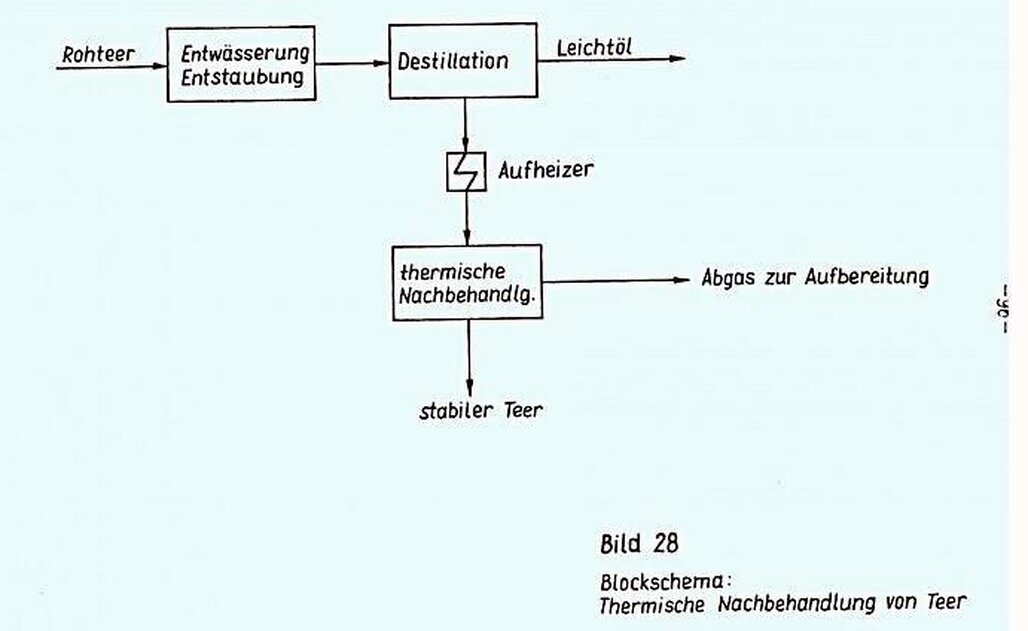 Es scheint daher sinnvoll, Teere durch eine thermische Behandlung aufzuarbeiten, wenn nachgeschaltete Weiterverarbeitungsverfahren besonders sauerstoffarme Teere erfordern. Bild 28 zeigt einen entsprechenden Verfahrensvorschlag /83/. Der Rohteer wird nach Entwässerung, Entstaubung und Destillation auf eine Temperatur von 200 bis 300°C erwärmt und in einem Tankreaktor bei dieser Temperatur über eine Verweilzeit von 30 - 60 Minuten belassen. Das entstehende Abgas enthält CO2, CH4 sowie CO und muss aufgearbeitet werden. Das Verfahren ist energetisch dann besonders günstig, wenn es mit dem Nachverarbeitungsverfahren direkt gekoppelt ist.