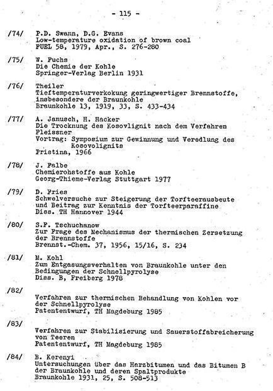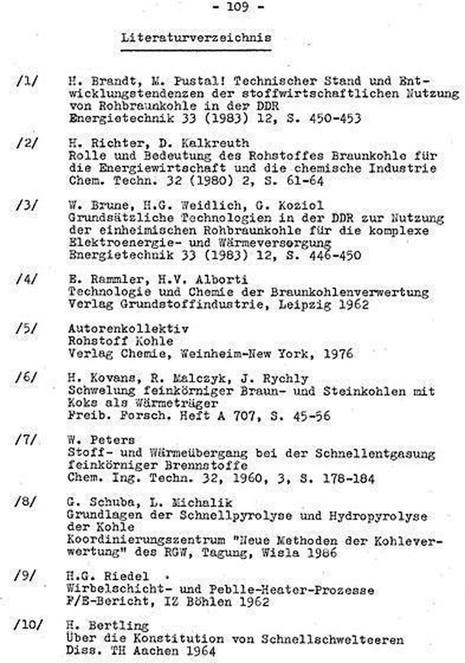 Durch die Versuche von Riedel /9,69/ mit einer Wirbelschichtanlage in Böhlen und eine längere Betriebszeit einer Anlage nach dem Lurgi-Ruhrgas-Verfahren in Lucavac (Jugoslawien) /5/ ist bewiesen, dass man für Braunkohle nach beiden Verfahren betriebsfähige Anlagen errichten kann. Die Qualität der erzeugten Teere - Staubgehalte bis 30% , Wassergehalte bis 40% entspricht aber nicht den Anforderungen der derzeitigen Teerverarbeitungsverfahren. Dieser Umstand dürfte auch zum damaligen Abbruch der Arbeiten an beiden Verfahren beigetragen haben.